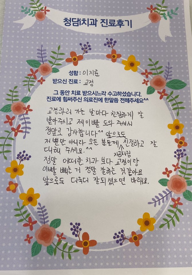 교정하러 가는 날마다 친절하게 잘 받아주시고 제 이빨도 도와주셔서 정말로 감사합니다^^