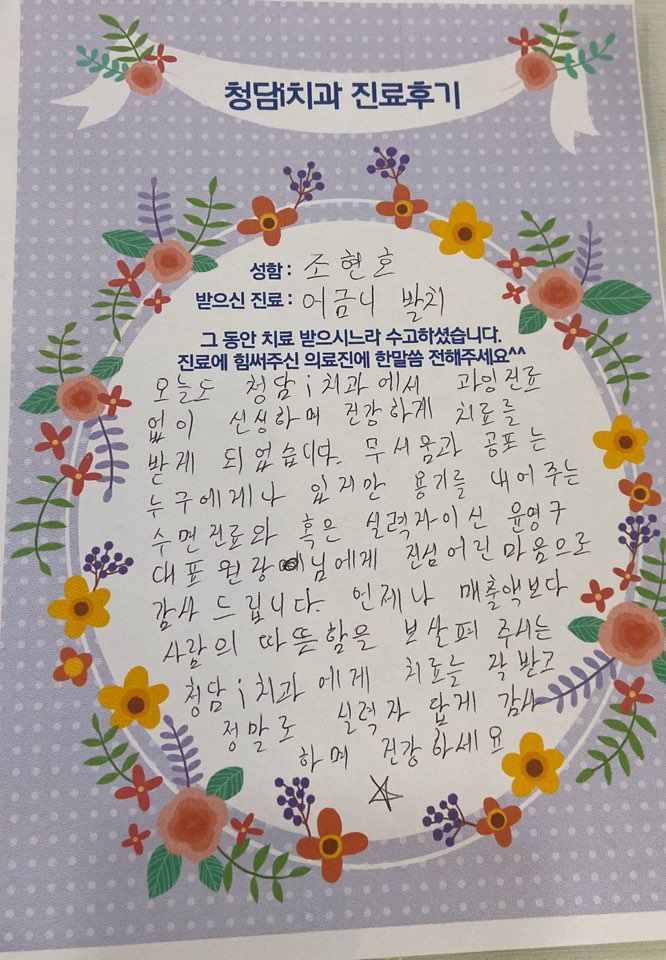 오늘도 청담 i 치과에서 과잉진료없이 신성하며 건강하게 치료를 받게 되었습니다. 무서움과 공포는 누구에게나 있지만 용기를 내어주는 수면진료와 혹은 실력자이신 윤영구 대표원장님에게 진심어린 마음으로 감사드립니다. 언제나 매출액 보다는 사람의 따뜻함을 보살펴 주시는 청담 i 치과에게 치료를 잘받고 정말로 실력자 답게 감사하며 건강하세요. ☆